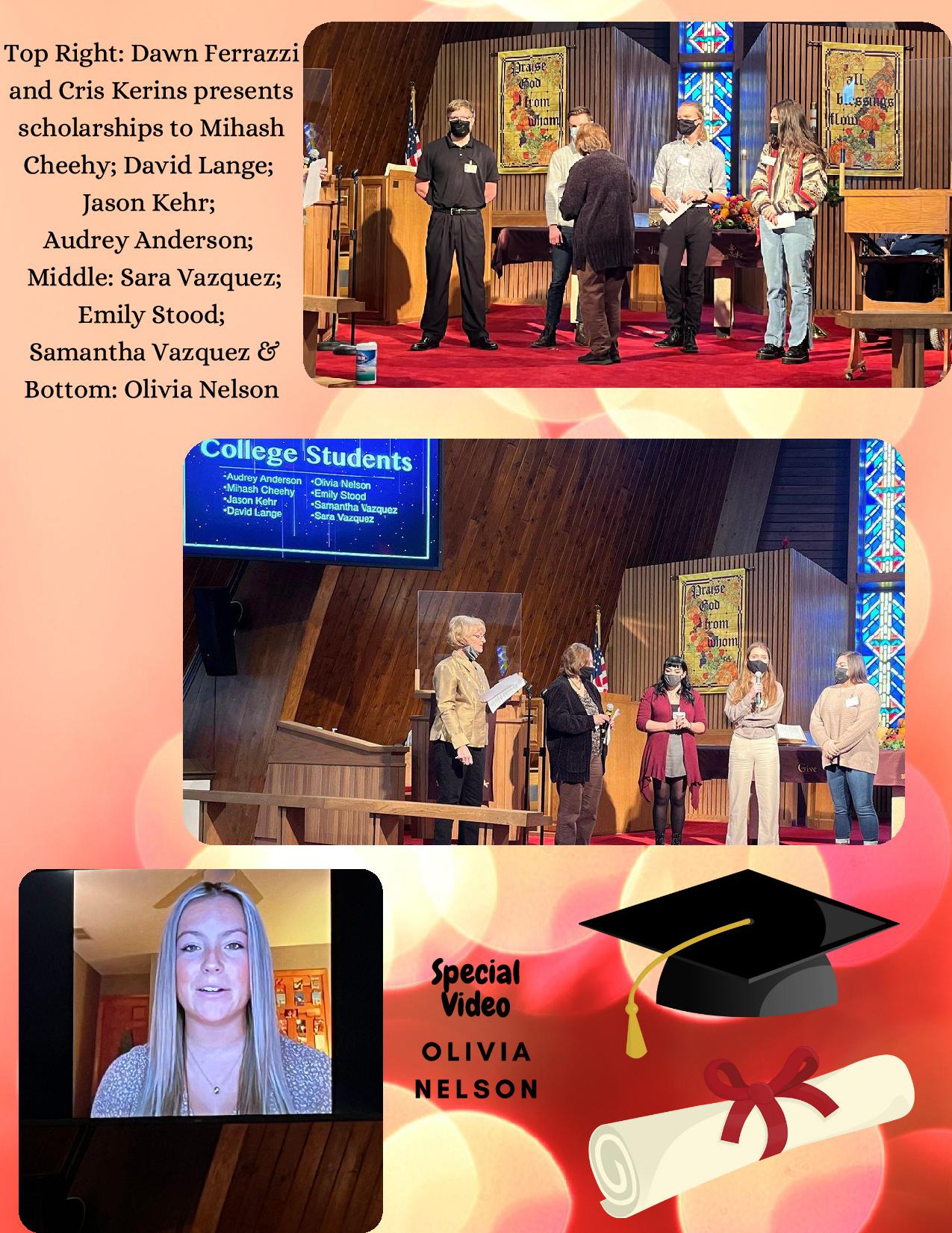 We are so fortunate to have people in our church who look toward the future. Years ago some families who felt God's calling, invested money for college scholarships. These scholarships were to acknowledge our students' involvement in church, to promote their continuing dedication to spiritual growth, and to help them with their educational goals.